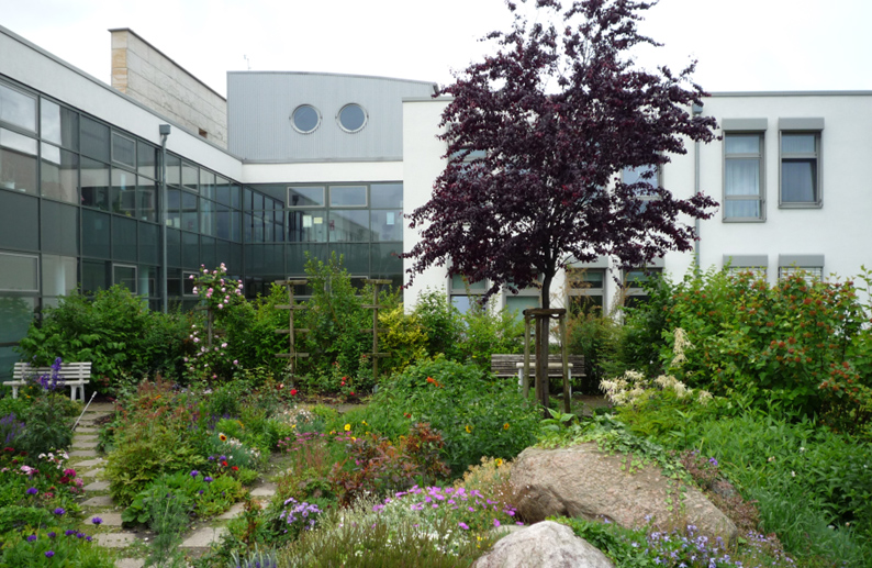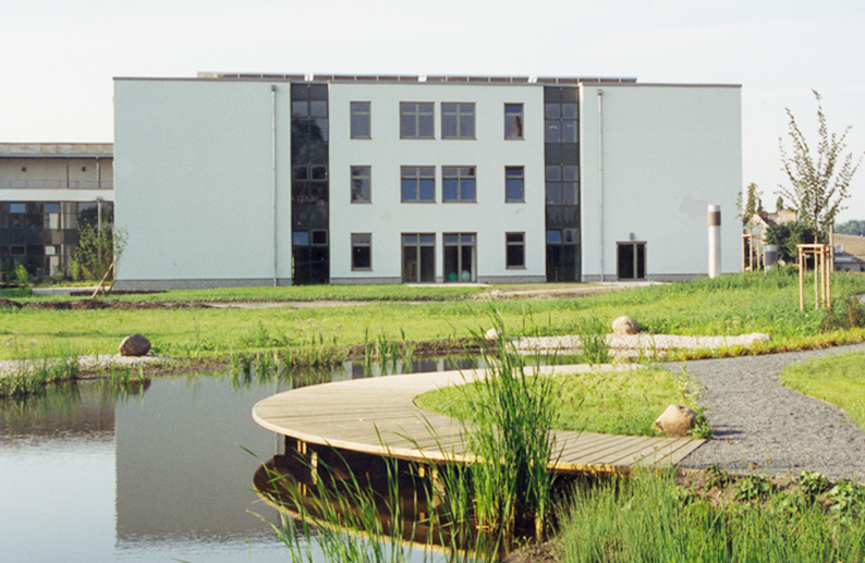 Gestaltung der Verkehrsanlagen (Anliegerstraßen, Kreisverkehr, Gehwege und Parkflächen) und Außenanlagen (Sinnesgarten mit Teich, Geriatriepfad mit Pflasterungen, Duftpflanzen und Klangspiel, Andachts- und Meditationsplatz verschiedene Themengärten) für die Klinik Bosse in Wittenberg